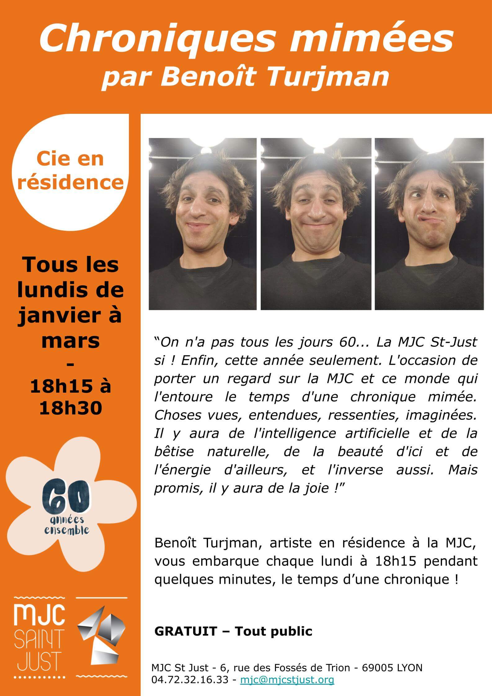 “On n’a pas tous les jours 60… La MJC St-Just si ! Enfin, cette année seulement. L’occasion de porter un regard sur la MJC et ce monde qui l’entoure le temps d’une chronique mimée. Choses vues, entendues, ressenties, imaginées. Il y aura de l’intelligence artificielle et de la bêtise naturelle, de la beauté d’ici et de l’énergie d’ailleurs, et l’inverse aussi. Mais promis, il y aura de la joie !”