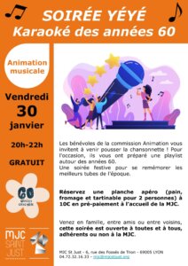 Les bénévoles de la commission Animation vous invitent à venir pousser la chansonnette ! Pour l’occasion, ils vous ont préparé une playlist autour des années 60.