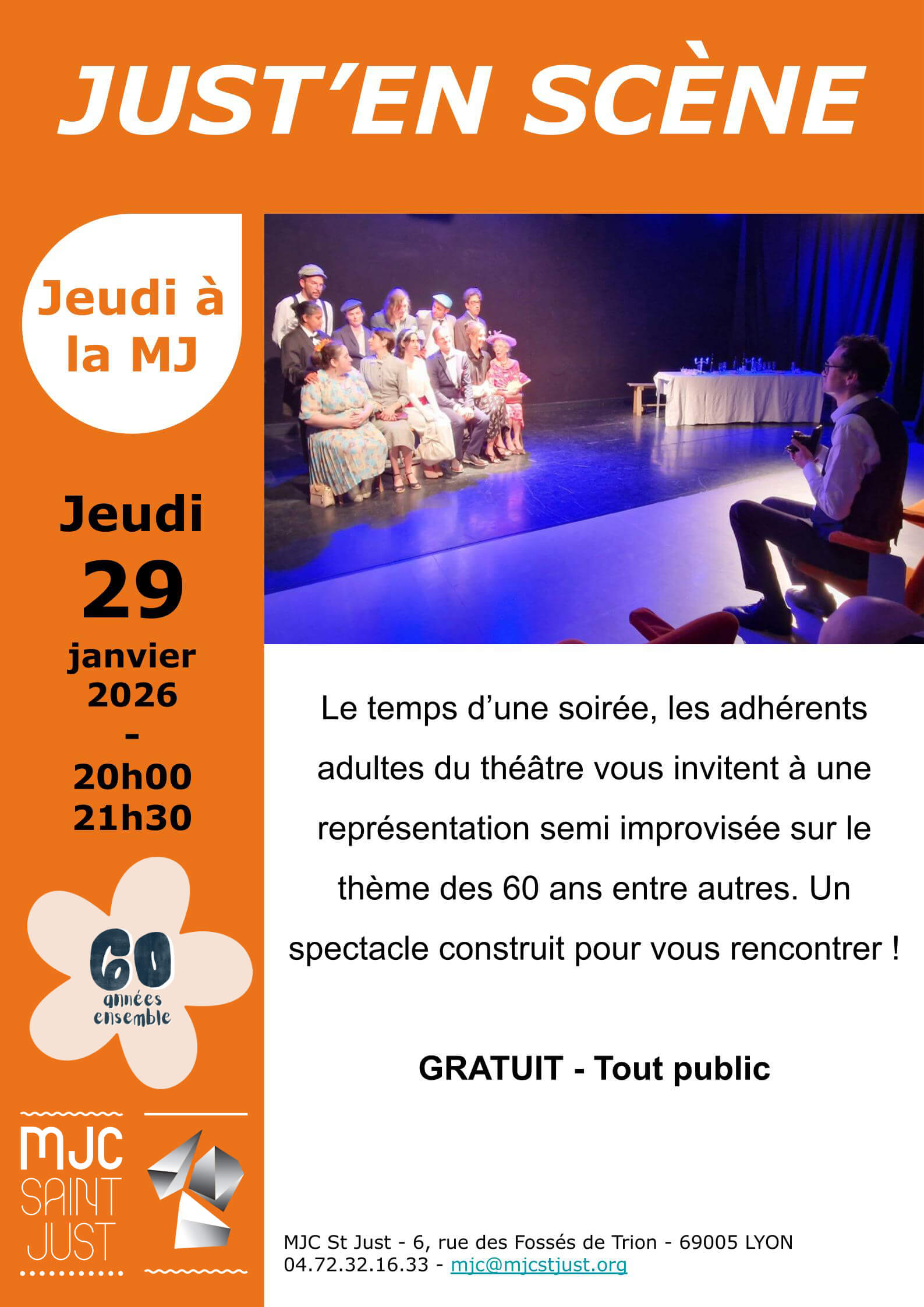 “On n’a pas tous les jours 60… La MJC St-Just si ! Enfin, cette année seulement. L’occasion de porter un regard sur la MJC et ce monde qui l’entoure le temps d’une chronique mimée. Choses vues, entendues, ressenties, imaginées. Il y aura de l’intelligence artificielle et de la bêtise naturelle, de la beauté d’ici et de l’énergie d’ailleurs, et l’inverse aussi. Mais promis, il y aura de la joie !”